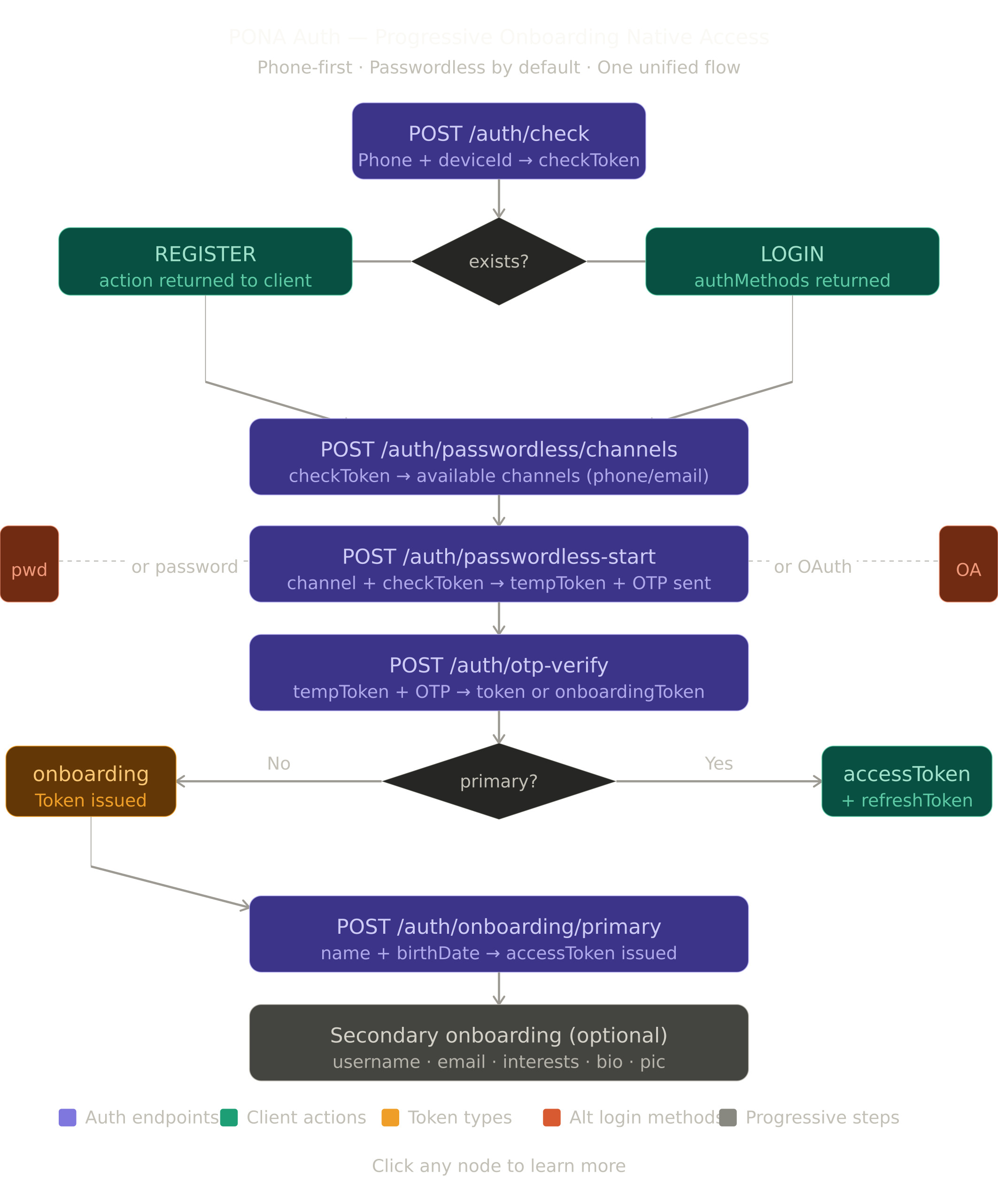 PONA Auth is NextGate's unified, phone-first authentication system. It replaces all legacy auth flows with a single coherent pipeline. Here is the core philosophy: